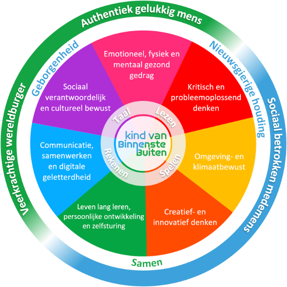In BinnensteBuiten willen wij kinderen op een goede manier voorbereiden op hun toekomst en hun rol in de maatschappij. Wij willen dat kinderen zich kunnen ontwikkelen tot actieve en verantwoordelijke burgers van een complexe en dynamische gemeenschap waarin iedereen anders, maar gelijkwaardig is. In onze visiecirkel is te zien dat wij met onze activiteiten willen zorgen voor een nieuwsgierige en open, maar ook kritische houding. Met als doel dat onze kinderen zich kunnen ontwikkelen tot sociaal betrokken, authentieke, gelukkige mensen en daarmee veerkrachtige wereldburgers worden. Wij leren kinderen kritisch te denken en te handelen. Jonge kinderen leren spelenderwijs binnen een rijke speel-, leeromgeving die samen met de kinderen wordt gemaakt. Oudere kinderen krijgen de nodige kennis van de (digitale) wereld mee. De activiteiten en lesmethoden die wij aanbieden in ons kindcentrum sluiten aan bij onze visie. Hierbij zorgen we voor een doorgaande lijn van 0 tot 13 jaar. Contact met ouders/verzorgers vinden we BinnensteBuiten uitermate belangrijk. We houden van korte lijnen en ouders/verzorgers zijn altijd welkom.